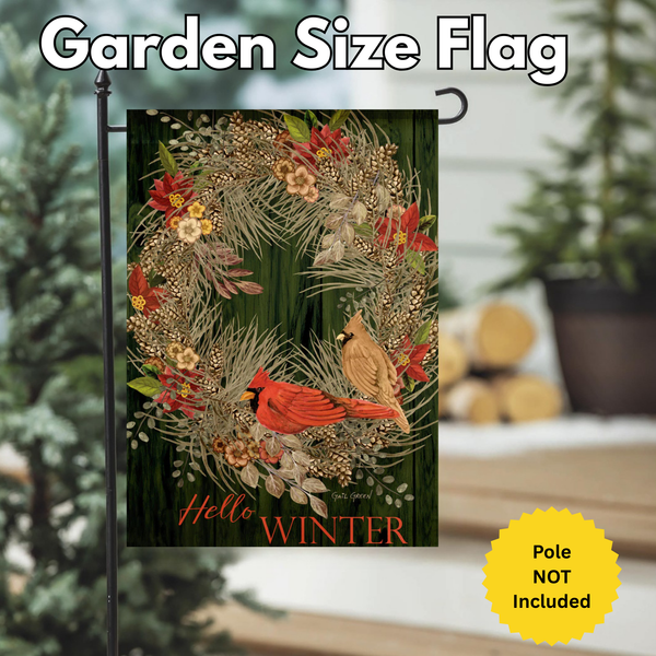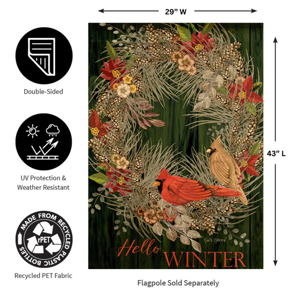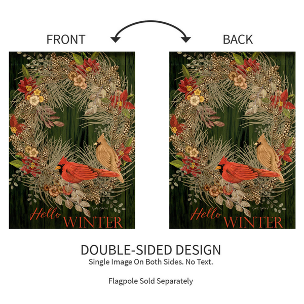 Decorate for the season and welcome friends and family to the home with this moire flag. It features a beautiful wreath with flowers and leaves. Two cardinals are sitting on it, and it has a “Hello Winter” message. Evergreen’s Moire flags deliver unmatched shimmer with a beautiful woodgrain effect that enhances each seasonal design. Artwork is heat-transferred onto both sides of the taffeta-like fabric with UV-protected dyes to guarantee vibrancy and durability through all seasons.