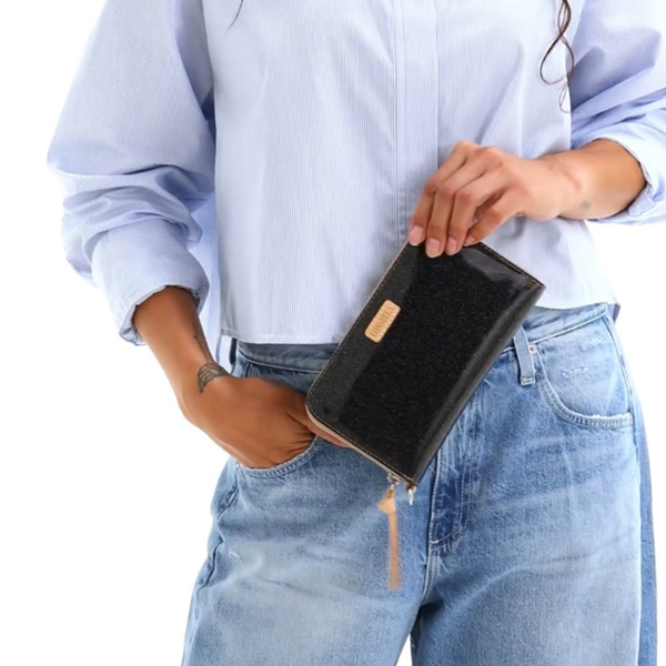 Function and versatility in the palm of your hand. Our new Essential Wallet is a streamlined,  large capacity wallet with tons of room for cards, cash, and receipts — plus a zippered center compartment for coins and keepsakes. We added a D-ring so you can easily clip it to any Consuela wristlet strap or anchor onto an inside lanyard for added security.