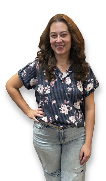 Ribbed Floral Print Short Sleeve Top