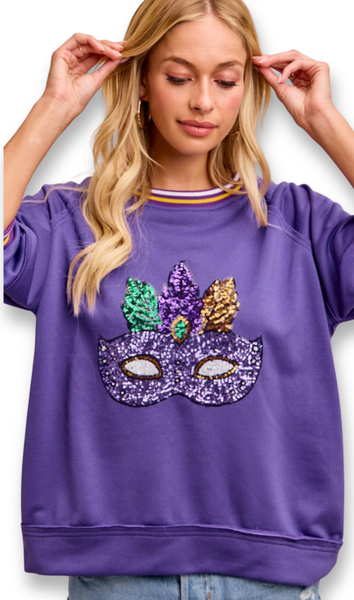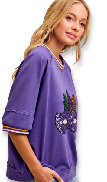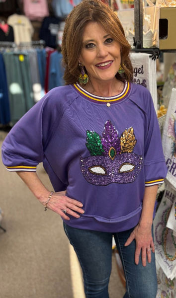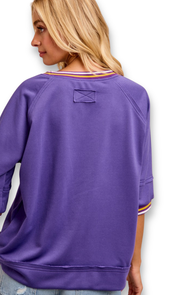 -Round Neck, Jersey Style neck hem-Short Sleeve, to Elbow, Jersey Style sleeve hem-Casual, Loose Fit, medium length topColor: LavenderKaren is wearing a SMALL