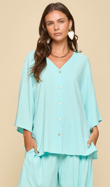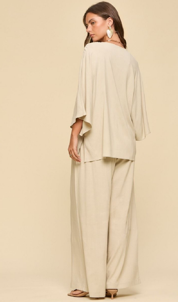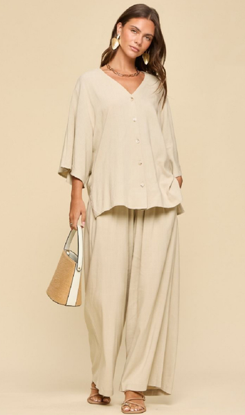 This beautiful linen set is perfect for your get away vacation! We love the button details on front with elastic pants! It's chic, fashionable, and easy to wear! Non sheer, woven. Relaxed, a bit oversized, loose fit.