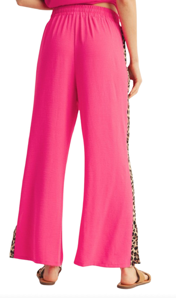 The pants feature side leopard with a small slit at the hem and include pockets