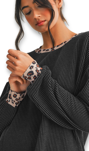 🐆 Twisted ribbed texture gives this 2-piece set a cozy, modern feel. ✨ Bold leopard print patchwork adds a trendy statement. 🩳 Soft, stretchy fabric keeps you comfy from day to night. 👚 Effortlessly stylish for lounging or casual outings.