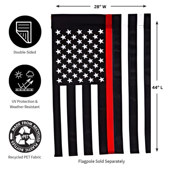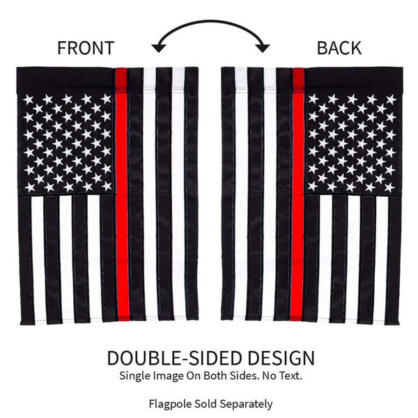 This traditional red, white and black flag is a classic display of Fire Fighter pride with its long lasting color. This applique flag is made of weather-resistant, 310 denier nylon to ensure the design will withstand all seasons. We combine pieces of fade-resistant, strong fabric with tight, detailed stitching to create a dimensional mosaic effect. The soft yet heavyweight material illuminates beautifully in sunlight. Each flag features a sleeve that fits standard flagpoles or stands, sold separately.