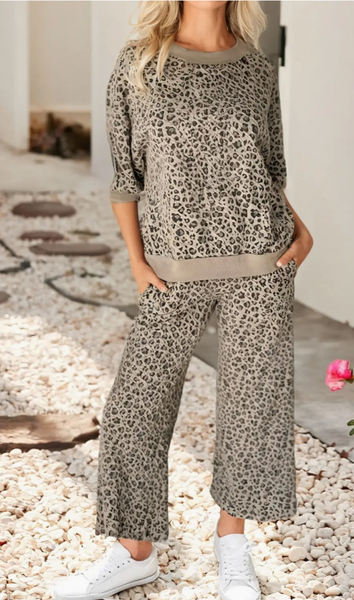 Leopard Patchwork Long sleeve Pullover Wide Leg Pant Set in Khaki