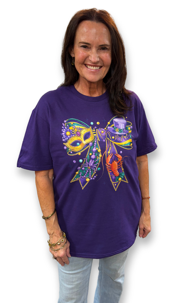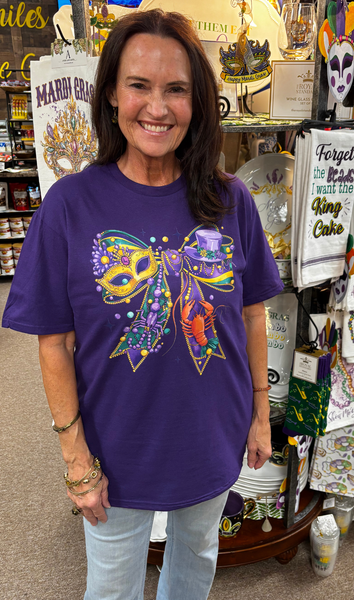 * This graphic t-shirt's design features a ribbon bow decorated with all kinds of Mardi Gras themed objects, including a gold mask, strings of beads, a top hat, and a crawfish. This top is perfect for Mardi Gras season!