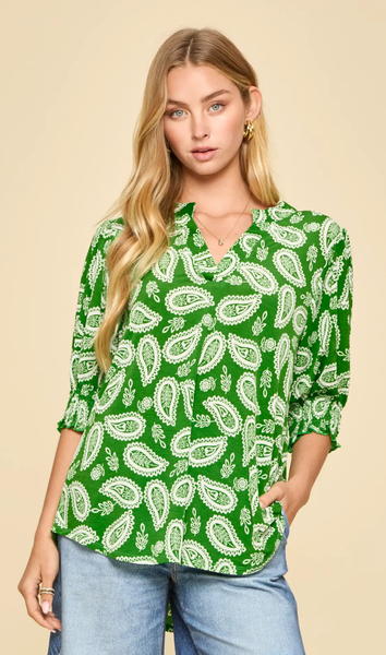 LIZZY SMOCKED SHORT SLEEVE IN KELLY GREEN MULTICOLORS PATTERN