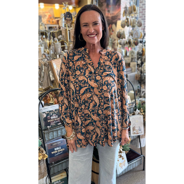 Our signature Lizzy Top is crafted from a soft, luxurious poly blend that offers lightweight, wrinkle-free comfort. Designed for easy care, this travel-friendly top is cooler than linen, making it the ultimate choice for life on the go. The Lizzy also features a mandarin collar neckline and 3/4" length sleeves with tab details. Its relaxed, flowy fit and subtle high-low hemline ensure a flattering silhouette for any occasion.