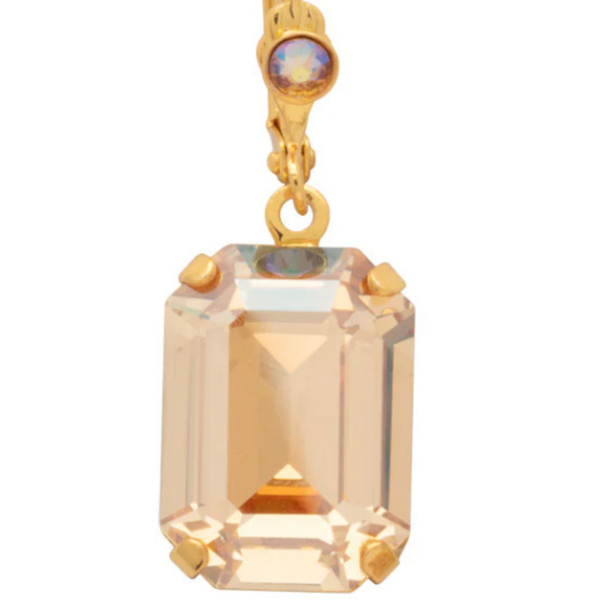 The Kathleen Studded Dangle Earrings feature a single emerald cut candy gem crystal dangling from a round crystal studded lever back French wire. From Sorrelli's Honey Bourbon collection in our Bright Gold-tone finish.