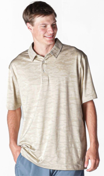 The Men's Polo features: -button polo neckline / collar -short sleeves -Simply Southern logo label -beige print