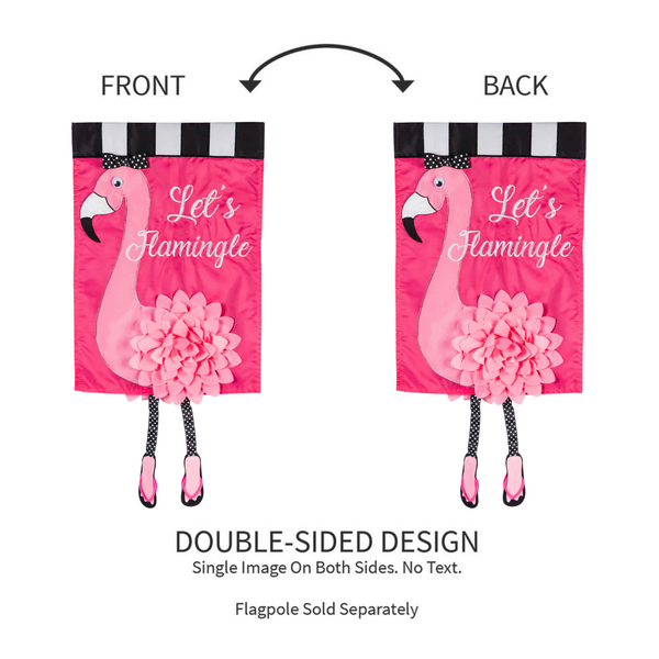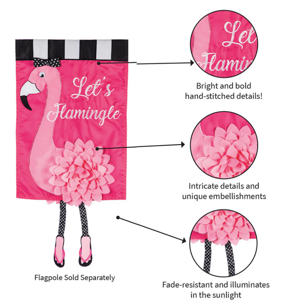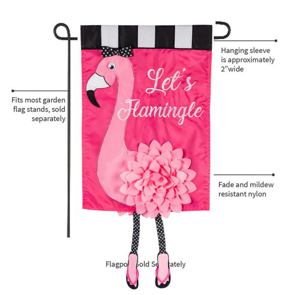 Add peppy pink pizzazz to your space with this Let's Flamingle appliqu?© garden flag. The dimensional design features a cheerful flamingo friend who is rocking a polka-dot bow and fun accents like googly eyes and dangling legs. Our appliqué flags were first introduced more than 20 years ago, and thanks to their bold designs and top-of-the-line materials they continue to be just as popular today. Each flag is made of strong 310 denier nylon to withstand all types of weather. We combine pieces of fade-resistant fabric with tight, detailed stitching to create a mosaic effect. The soft yet heavyweight material illuminates beautifully in sunlight.