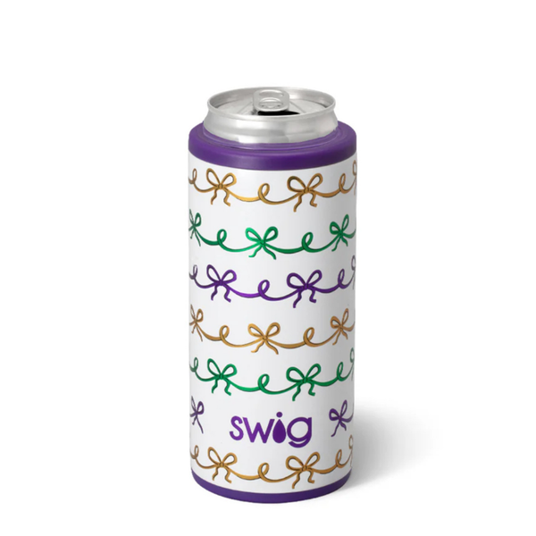Cold sips, no sweat! 💧Bring on the bows, beads, and bourbon with this Mardi-ready print, featuring purple, green, and gold metallic bows on a glitter white background.