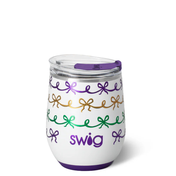 The Swig that started it all! ✨Bring on the bows, beads, and bourbon with this Mardi-ready print, featuring purple, green, and gold metallic bows on a glitter white background.