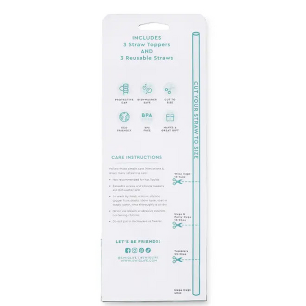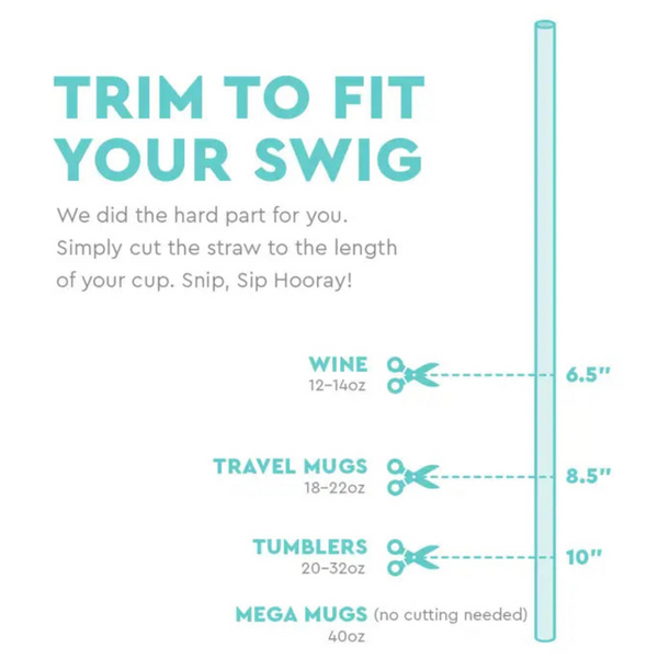 Compatible with all Swig tumblers and fits most other standard drinkware brands. Straws can be cut to size using the diagram featured on the back of the packaging. Pull gently when removing the protective cap to avoid damage.