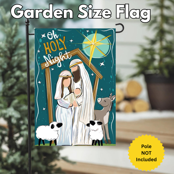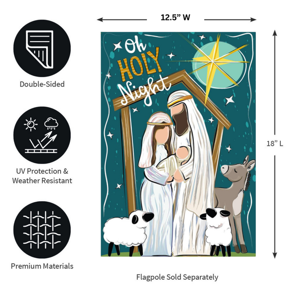 Decorate for the season and welcome friends and family to the home with this burlap garden flag. It features a sweet Nativity Scene. Crafted of medium-weight, soft polyester burlap fabric, this flag has the look and feel of real burlap. Artwork is heat transferred onto both sides of the textured fabric to create a natural, crafted look. The poly-burlap is a durable and weatherproof material that will not fade or fray after continued use. All flags also feature a sleeve for use with any standard flagpole or stand, sold separately.