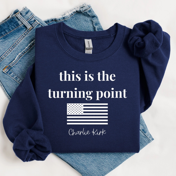 … front says this is the turning point with American Flag and Charlie Kirk’s name